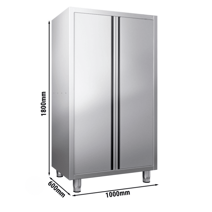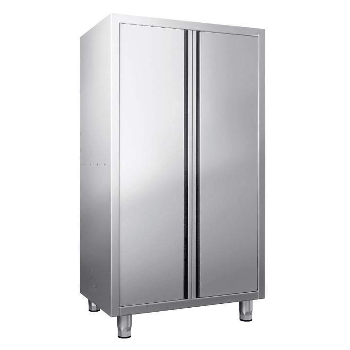 Stainless steel crockery cabinet with two sliding doors and a spacious vertical design, offering hygienic and organized storage for dishes and kitchen equipment in professional food service environments.
