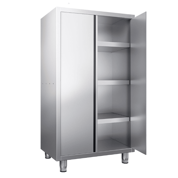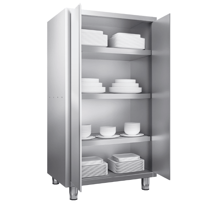 Equipped with three internal shelves, the cabinet offers flexible storage for plates, trays, containers, and kitchen tools. Rounded corners and a welded construction enhance hygiene and safety, while height-adjustable stainless steel feet ensure stability on uneven floors. Manufactured in compliance with CE standards and European food safety regulations, this unit is built for reliable, hygienic, and professional use.
