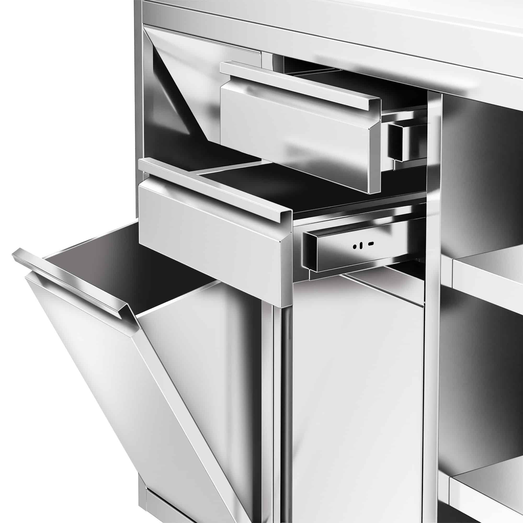 The cabinet includes two smooth-glide drawers for tools and accessories, a lockable cabinet door with internal shelving for additional storage, and an integrated waste bin that helps maintain cleanliness during service. Height-adjustable stainless steel feet provide stability on uneven surfaces, making this work cabinet suitable for long-term professional use.