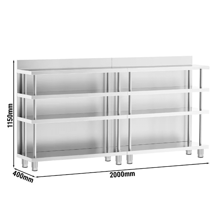 Stainless steel bar work table with a 2000 × 400 mm working surface, equipped with four shelves and a rear upstand, designed to provide efficient workspace and organized storage in professional bar, café, and food service environments.